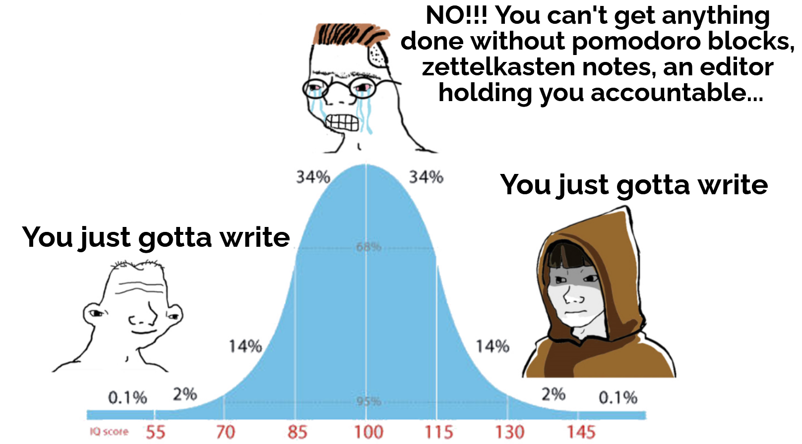 But these days I'm older and (marginally) wiser. I've also been down lots of rabbit holes in productivity, organizational design, and psychology. And what's clear to me is that the Stinson approach of "Step one: write" is the scrub side of the curve. You can build a practice that way. It'll be shaky, prone to crumble when motivation fails or deadlines pass, but you will write. You may also develop an antagonistic relationship with the craft.